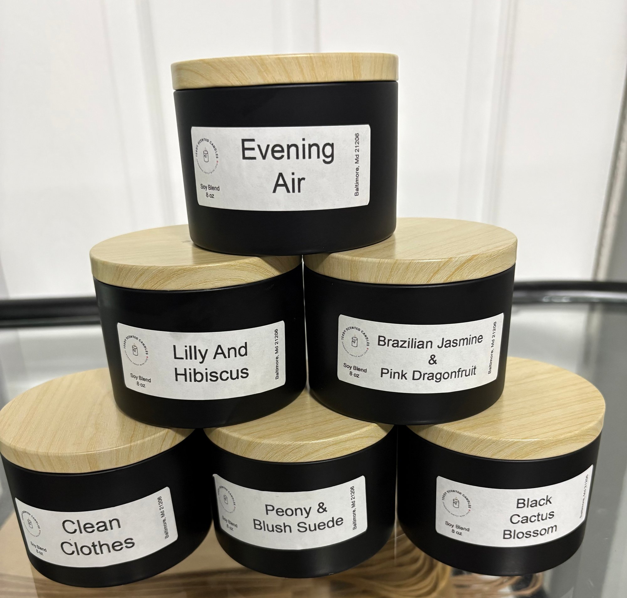 Traditional Clean, Fresh and Flower-Scented Wicked Container Candles hand made with blended soy and coconut wax and blended soy and (food grade) paraffin wax.